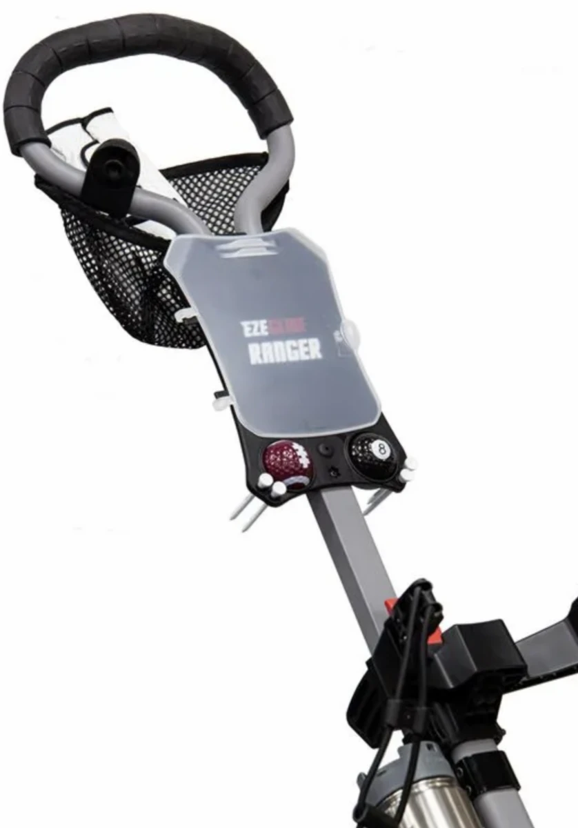 EzeGlide Ranger 3 wheel trolley is great value 3 wheel trolley with a range of features and a lightweight sturdy frame construction. A quick-fold mechanism enables the trolley to be folded flat in seconds. Includes scorecard holder with ball storage space , a mesh storage compartment for other accessories and drinks holder is included. Elasticated Bag Strap On The Top And Bottom. Wide wheelbase ensures optimum stability and easy manoeuvrability. Quick-release side wheels for ease of storage. Some Other features include a click on, click off footbrake.